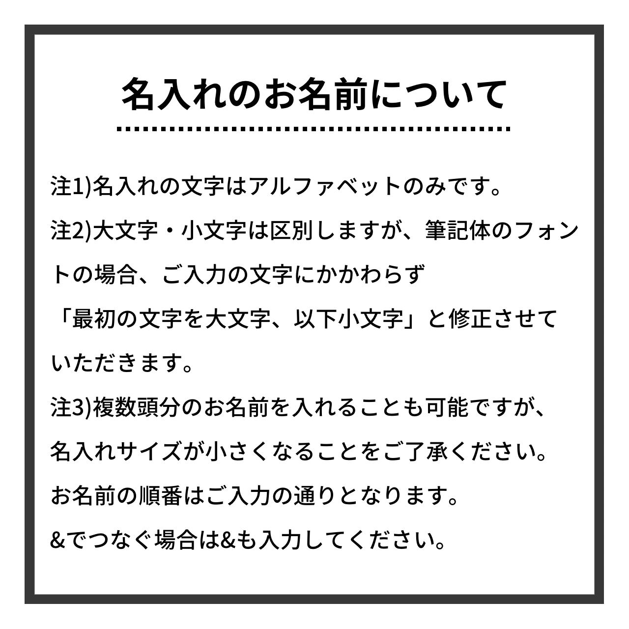 お名前の入力欄に犬種名を入力していただき、画像見本のようにシンプルな犬種名でオーダーいただくのもアリですよ◎